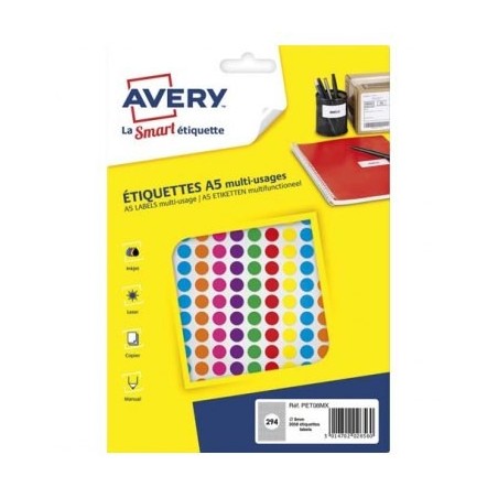 AVERY Sachet de 2058 pastilles Ø8 mm. Imprimables. Coloris assortis