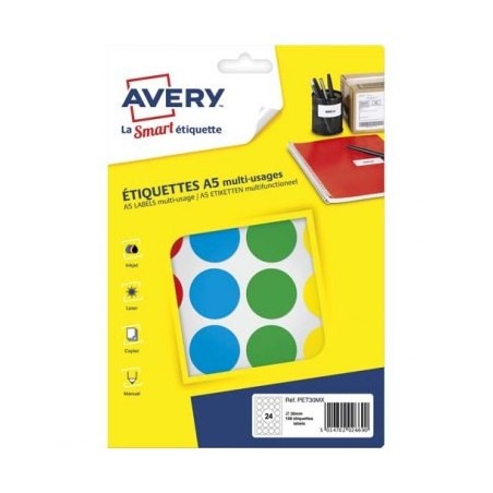 AVERY Sachet de 168 pastilles Ø30 mm. Imprimables. Coloris assortis